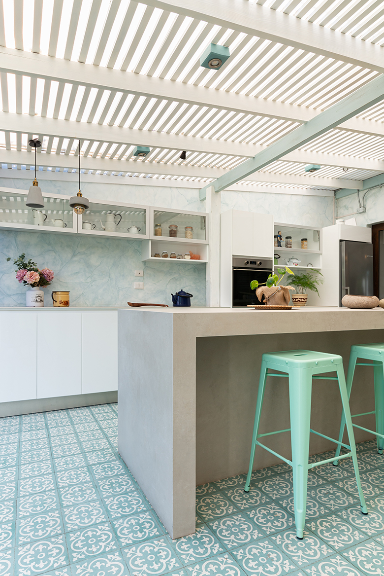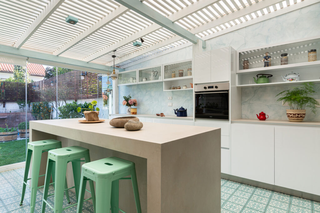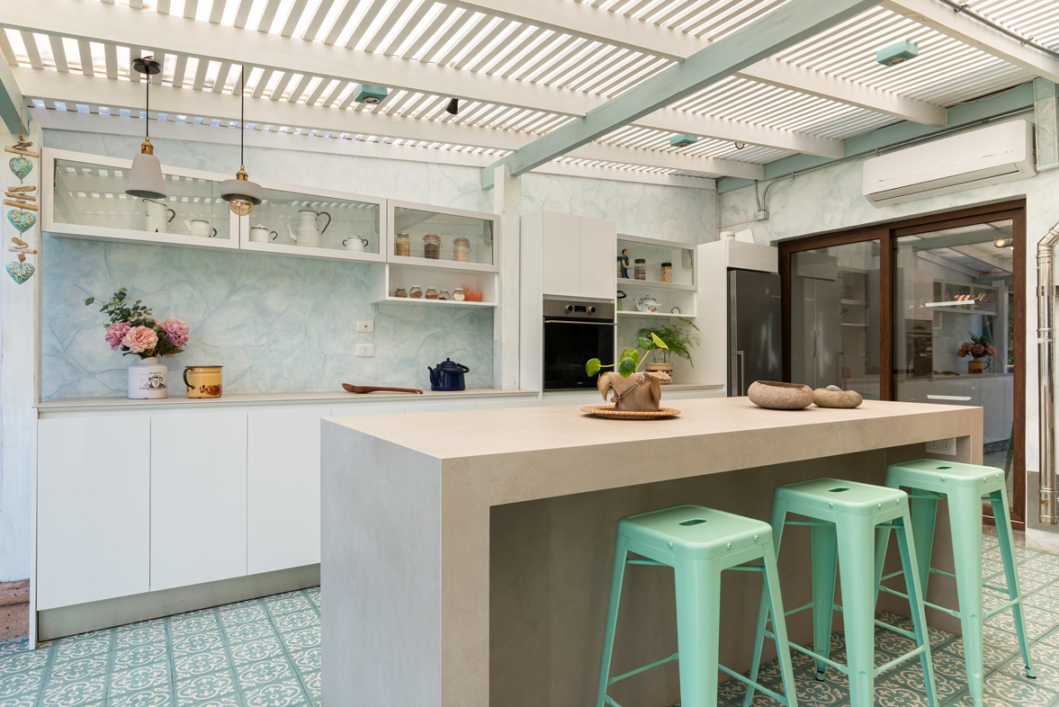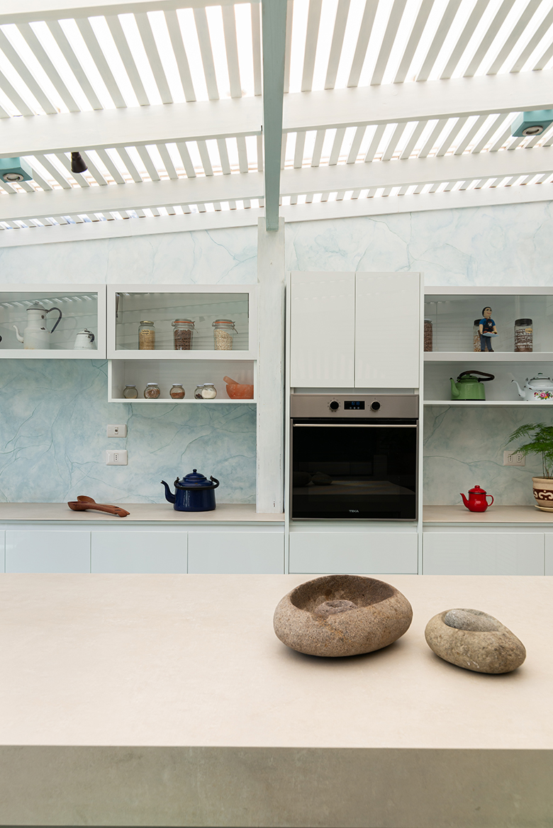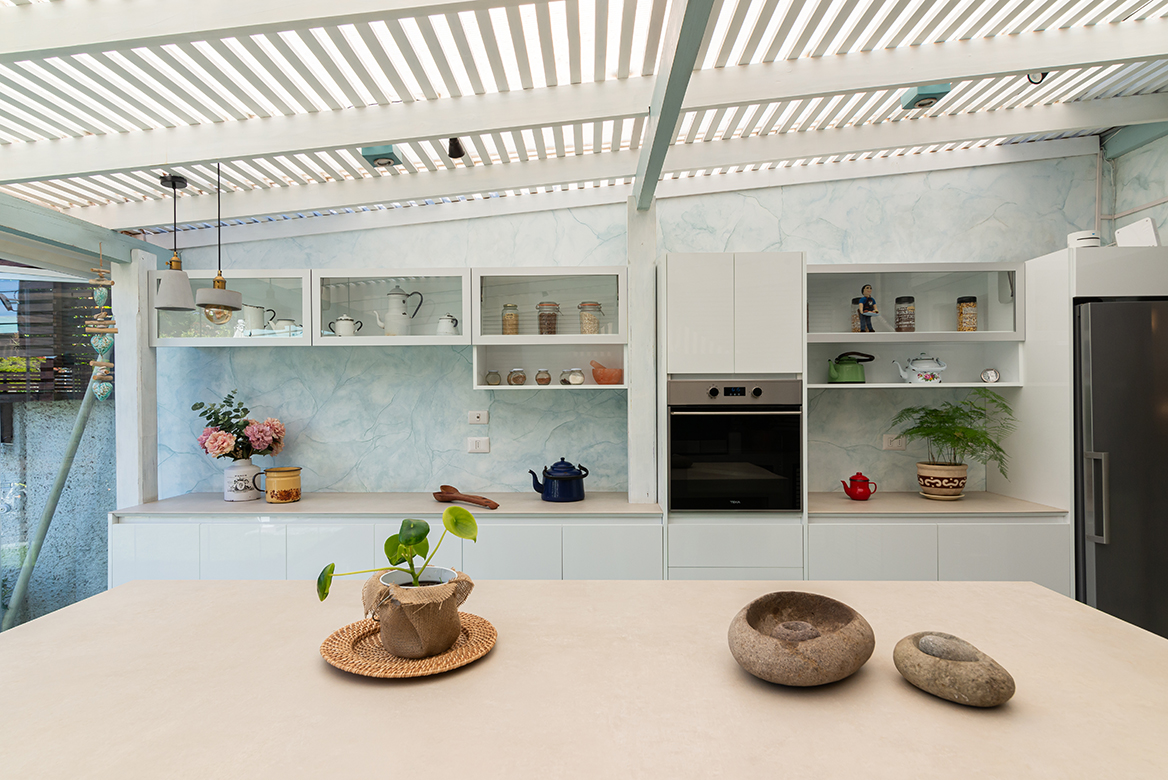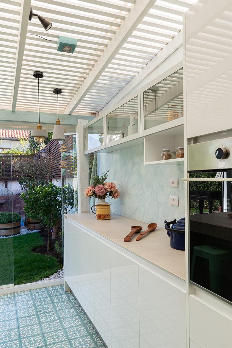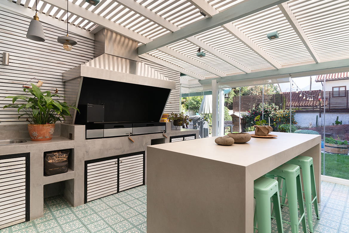Quincho fabricado en melamina blanca alto brillo y cubiertas Fiandre Moon, espacio creado especialmente para el uso diario y la incorporación de éste en el día a día del hogar, integrando todo lo necesario para compartir en familia y crear un ambiente acogedor y completo donde cocinar siempre es la principal razón de las reuniones.